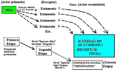 Esas ONGs trabajan como “Actores primarios” sobre estamentos “Receptores intermedios” pero de gran peso e influencia (Primera etapa) buscando que, una vez adoctrinados, se transformen a su vez en “Actores secundarios”(Segunda Etapa) para influir sobre el resto de la sociedad (en otras palabras: que terminen trabajando para la ONG).