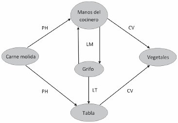 ![]() Figura 1. Modelo conceptual. Objetos y acciones que intervienen durante la preparación de las hamburguesas caseras y el acondicionamiento de los vegetales que serán utilizados como guarnición. Preparación de la hamburguesa (PH), corte de los vegetales (CV), lavado de manos (LM) y lavado de la tabla (LT). |