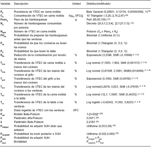 Para la construcción del modelo se recurrió a información científica publicada sobre las tasas de transferencia de microorganismos entre los diferentes elementos. La información sobre prevalencia y concentración de VTEC en la carne picada fue obtenida a partir de una evaluación cuantitativa de riesgos de VTEC por consumo de hamburguesas realizada en Argentina (18), mientras que los hábitos de consumo hogareños fueron obtenidos a partir de una encuesta realizada durante los meses de junio y julio de 2008 en hogares del centro de la provincia de Santa Fe, Argentina (13). Las distribuciones de probabilidad que mejor describieron cada etapa del proceso (Tabla 1) fueron incorporadas en el programa @Risk® versión 4.5 (Palisade, New York), y se realizaron las iteraciones correspondientes empleando la técnica de simulación Monte Carlo para generar las variables de resultado (ej. probabilidad de adquirir SUH). La técnica de Monte Carlo selecciona repetidamente valores al azar a partir de las distribuciones de probabilidad que caracterizan a las variables de entrada del modelo y genera múltiples escenarios del problema. Con los resultados obtenidos se estimó la probabilidad de infección por VTEC asociada al consumo de vegetales contaminados, producto de la contaminación cruzada durante la elaboración casera de hamburguesas y se identificaron las variables más importantes que impactan en dicho evento.