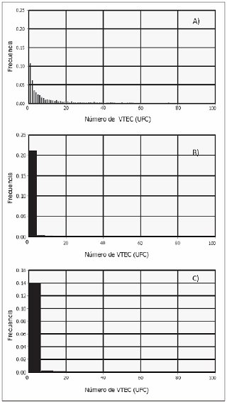 ![]() Figura 2. Distribución de probabilidad acumulada del número de VTEC en: A) carne molida, B) manos del cocinero y C) vegetales. |