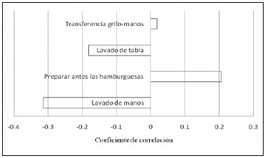 El hábito de preparar alimentos crudos antes que los alimentos listos para su consumo, incentivado muchas veces por el hecho de que es durante el transcurso de la cocción de los primeros cuando se preparan los segundos, favorece la contaminación cruzada y aumenta el riesgo de transmisión de patógenos entre alimentos. El lavado de la tabla empleada durante la preparación de los alimentos presenta un elevado OR, lo que pone de manifiesto su importancia para reducir la contaminación cruzada. Otra medida que puede sugerirse es el empleo de dos tablas diferentes, una para la preparación de las hamburguesas y otra para manipular los alimentos listos para su consumo, como los vegetales frescos.