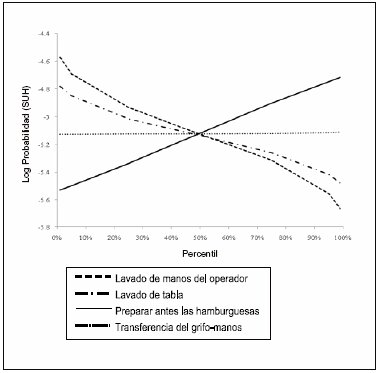 Los valores de probabilidad de adquirir SUH de los extremos de las curvas de la Figura 5 (correspondientes a los percentiles 1% y 99%) fueron utilizados para calcular el OR para las variables que presentaron mayor correlación. Así, el OR de adquirir SUH fue 12,02 veces mayor en caso que los operadores no se laven las manos; 6,57 veces mayor cuando se preparan las hamburguesas (a partir de carne molida cruda) antes que los vegetales que las acompañan y 5,02 veces mayor si no se lava la tabla donde se procesa la carne molida, mientras que fue 6,57 veces menor por el hecho de preparar las hamburguesas (a partir de carne molida cruda) luego que los vegetales que las acompañan. De esta manera, el riesgo de adquirir SUH se ve sustancialmente modificado cuando estas 3 variables se incorporan en el modelo (Figura 5) y pueden considerarse los principales factores de riesgo de contaminación cruzada de VTEC entre la carne y los vegetales. En contraposición, ese riesgo fue solamente de 1,039 cuando se consideró la transferencia del patógeno entre el grifo de agua y las manos del operador (Figura 5). Asimismo, es interesante destacar la importancia que tiene la contaminación cruzada causada a través de las manos del operador contra la insignificancia del aporte de la interacción entre el grifo y esas mismas manos.