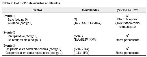 El grado de alteración audiométrica (Galt) si bien presenta las cinco categorías señaladas, se ha recodificado como binaria para definir los 3 eventos analizados (Tabla 2).