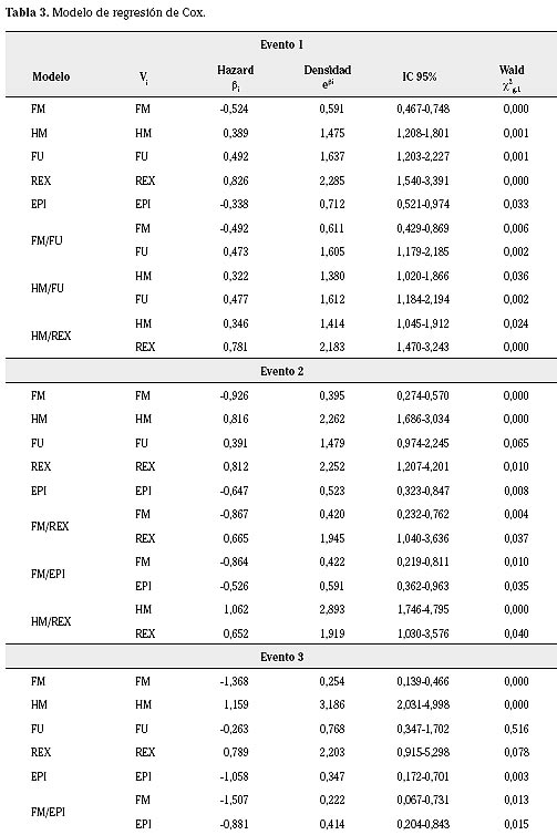 En la variable grado de alteración se comprueba que los niveles se ajustan a las condiciones de un evento de Cox, evento no repetible. El análisis se ha realizado sobre cada uno de los eventos indicados (Tabla 2).