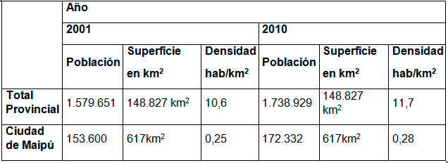 Según el Censo Nacional de Población del año 2010, el Departamento de Maipú está habitada por 172.332 personas. El total de la Provincia de Mendoza, reúne un total de 1.738.929 habitantes.