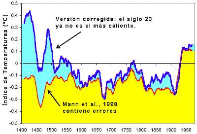 Según Mann, la temperatura de la tierra había ido descendiendo gradualmente desde 1400 hasta que el hombre comenzó a quemar combustibles fósiles a lo loco, momento en que la concentración de CO2 subió tanto que recalentó al planeta escandalosamente, sugiriendo la conveniencia de destruir a la civilización humana para “salvar al planeta.” Pero finalmente los análisis posteriores de Ross McKintrick y Steven McIntyre demostraron que la historia había sido muy diferente, y que se aprecia en el próximo gráfico corregido con los datos correctos, y no con los inventados por el pícaro algoritmo de Mann.