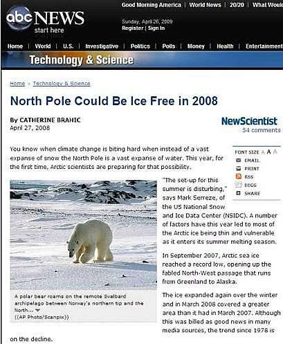 También comenzaron a bombardear a la gente con partes de prensa sobre el desastre de la plataforma Wilkins, como si fuese la primera y única vez que sucedía. El glaciólogo Ted Scambo ya venía publicando los repetidos colapsos y derretimientos de la Wilkins desde por lo menos 1998, y la prensa venía reciclando la noticia del descalabro de Wilkins y publicando siempre la misma foto para diferentes años. El penoso suceso fue ampliamente cubierto por este sitio en varios artículos aquí, aquí y aquí, y en especial por el meteorólogo Anthony Watts en su fantástico blog en http://www.WattsUpWithThat.com/