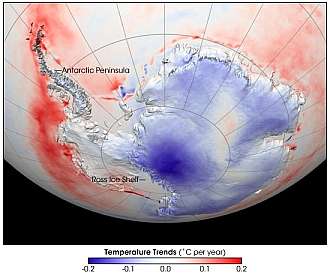 Así llegaron a la conclusión de que la Antártida hacía 50 años que se venía calentando, y había subido 0,5ºC en esos 50 años. El Gran Circo Mediático se puso en marcha en seguida y las buenas nuevas recibieron gran publicidad demostrando que por más que el sol se aquietase o se extinguiera, la Tierra seguiría calentándose por culpa del CO2 que había en la atmósfera. Otro largo período de descorchar champagne festejando la derrota de los escépticos y la inminente firma del nuevo Tratado de 2YKioto en Copenhague, en diciembre de 2009. Antes del estudio de Stieg & Mann, la NASA mostraba un mapa de la Antártida con las tendencias de temperaturas que los termómetros de verdad (y no los termómetros de videojuegos de Stieg y Mann) que indicaban que el 98% de la Antártida se estaba enfriando a paso sostenido, menos ese 2% que es la península Antártica.