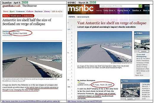 En la página de la izquierda del Guardian de Londres, la fecha es Abril 5, 2009, pero la de la derecha, del msnbc la fecha es del año anterior, Marzo 25, 2008. La verdad es que la placa Wilkins se quiebra todos los años, y no a causa del calentamiento. El calor no quiebra al hielo: lo derrite.