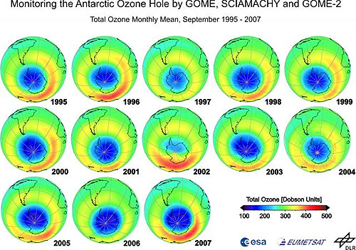 Estas imágenes muestran su tamaño cada septiembre durante los últimos años, como se derivan de los datos de los satélites GOME, GOME-2 y SCIAMACHY. |