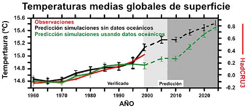 Figura 1 : Predicciones/pronósticos inicializados en retrospectiva (verde) para las temperaturas medias globales, comparadas con las observaciones y predicciones no inicializadas usando observaciones oceánicas y realizadas usando únicamente forzamientos radiativos. Se muestran los promedios decadales; las barras de error indican la extensión de los tres conjuntos de predicciones. |