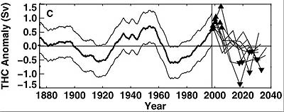 Pongo arriba la evolución de la temperatura desde Enero de 1990 hasta el pasado Marzo en la troposfera, la capa baja de la atmósfera (de unos 10 km de espesor) en la cual se desarrolla el clima. Abajo pongo un índice de la supuesta fuerza de la circulación termohalina (THC) (que es otra manera de referirse a lo mismo, MOC) (ver aquí: corrientes oceánicas). Se observa que la tendencia ascendente que se manifiesta desde 1970, y que ha coincidido con el calentamiento que siguió al enfriamiento anterior, puede cambiar a la baja en las próximas décadas y, por lo tanto, provocar de nuevo un enfriamiento. |