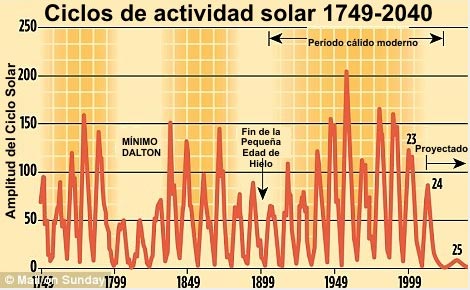 Mientras tanto, reconocidos científicos del clima le dijeron ayer al ‘The Mail On Sunday’ que, después de emitir niveles de energía desusadamente altos durante el Siglo 20, el sol se dirige ahora hacia un “Gran Mínimo” en sus emisiones, amenazando con veranos fríos, duros inviernos y un acortamiento de la estación de para cultivar alimentos.