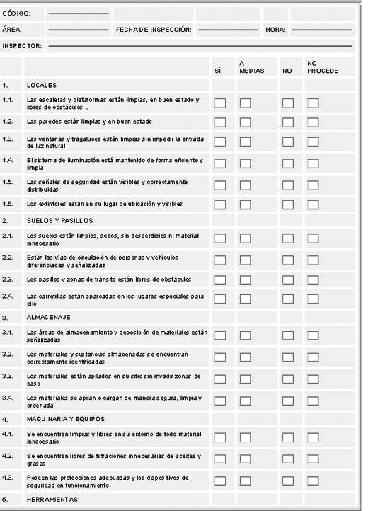 Se crearán normas de actuación específicas para realizar operaciones de limpieza sometidas a peligros concretos, (ej.: limpieza de máquinas, limpieza de derrames de productos peligrosos, operaciones de limpieza en espacios confinados, etc…) Complementariamente a la limpieza programada, cuando se genera una situación accidental, por ejemplo un derrame, hay que ser estricto e inflexible en su inmediata eliminación. Es un momento clave que pone en evidencia el compromiso asumido en este tema. Crear y consolidar hábitos de trabajo encaminados a favorecer el orden y la limpiezaLas tres etapas hasta ahora descritas pueden considerarse como actividades, como algo que se hace. En contraste, el crear y consolidar hábitos de trabajo correctos dentro de una disciplina de trabajo como objetivo último a alcanzar no se puede considerar como una actividad sino como “un estado o condición que existe cuando se mantienen las tres etapas anteriores”. Si tal disciplina de trabajo no se mantiene y los hábitos correctos de trabajo no se consolidan, las condiciones vuelven a los viejos e indeseables niveles de partida e incluso la realización de campañas ocasionales no alcanzarán los resultados previstos. Para convertir en hábitos la organización, el orden y la limpieza e implantar una disciplina de trabajo es necesario: