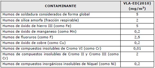 El Limite de Exposición Profesional (LEP) de 5 mg/m3 para los humos de soldadura considerados de forma global, que habitualmente se aplica en los procesos de soldadura sobre acero al carbono, se estableció cuando los LEP’s de los óxidos de hierro y de manganeso, que son los componentes mayoritarios de los humos de este tipo de soldadura, también eran de 5 mg/m3.