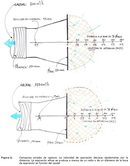 En la Figura 1 se esquematiza una soldadura con electrodo que utiliza una campana simple de captura con brazo articulado para aspirar los humos. Para el caso representado, con una campana de 250 -300 mm. de diámetro y con un caudal de aspiración comprendido entre 600 y 800 m3/h., la distancia a la que hay que situar la campana para que se produzca una aspiración eficaz es del orden del radio de la boca, es decir entre 12 y 15 centímetros.