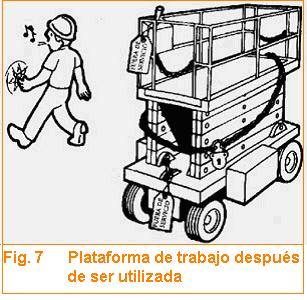 Al finalizar el trabajo, se debe aparcar la máquina convenientemente. Cerrar todos los contactos y verificar la inmovilización, trabando las ruedas si es necesario. Limpiar la plataforma de grasa, aceites, etc., depositados sobre la misma durante el trabajo. Tener precaución con el agua para que no afecten a cables o partes eléctricas del equipo. Dejar un indicador de fuera de servicio y retirar las llaves de contacto depositándolas en el lugar habilitado para ello. Fig. 7.