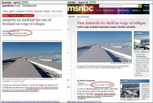 La vieja técnica legada por Goebbels, “Miente, miente, miente, que algo siempre quedará,” se hace clarísma aquí. La Placa o Plataforma Wilkins se formó cuando sobrevino la Pequeña Edad de Hielo hacia los años del 1700. Pero según hemos visto se ha venido “desmoronando, desprendiendo, colapsando, quebrando, …..” (elija el término que más le guste –pero no “Derritiendo“), por el natural avance del glaciar que la alimenta. Nada raro, nada que ver con el calor, ni con el calentamiento global, ni con el CO2. Toda la alarma tiene su conexión con que hay que mostrar algo -sobre lo que la gente no tiene ni idea!- para intentar justificar lo injustificable: que el calentamiento global está causando el derretimiento de la Antártida y que su consecuencia será un aumento del nivel del mar global de 1, 5, 10, ó 60 metros, cifras que varían de acuerdo con la dureza de la cara de quien hace la profecía.¿Será posible que la gente siga creyendo en tantas mentiras y tantas profecías que no han mostrado ni la menor señal de querer cumplirse? Que la mitad de los EEUU morirían de hambre para el año 2000 -y la gran preocupacion hoy es la obesidad. Que el petróleo se agotaría para 1990 -y las reservas que se siguen descubriendo cada vez son más grandes. Que los tornados, huracanes y tifones aumentarían en intensidad y frecuencia -y estamos en el período más bajo en 35 años de todos esos eventos meteorlógicos.