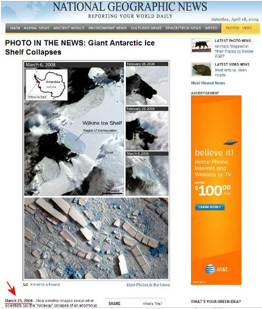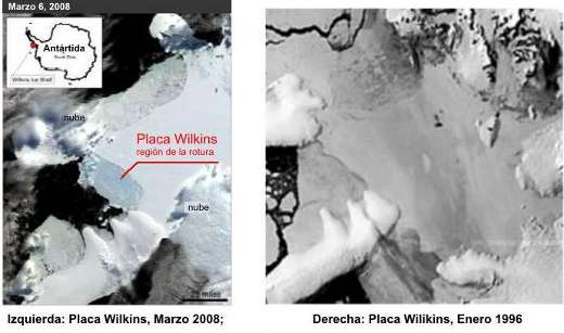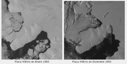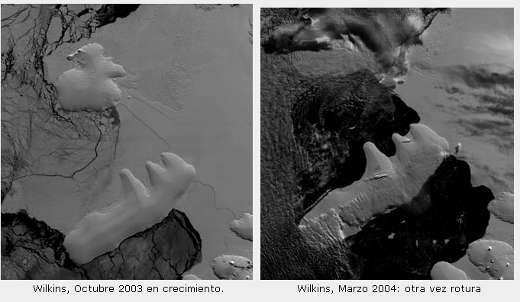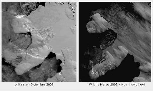 “En el lado sudoeste de la Península, la placa de hielo Wilkings se retiró unos 1.100 kilómetros cuadrados a principios del año pasado” [1998], dijo Ted Scambos. … “Es posible que dentro de algunos pocos años la placa dehielo Wilkins haya desaparecido.” [link aquí.]