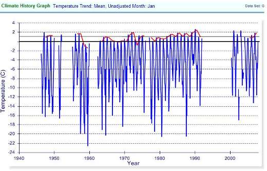 La estación más cercana a la Place de Hielo Wilkins es Rothera Point, de la base de datos del NOAA Global Historical Climate Network, con temperaturas mensuales en azul y la temperatura anual de Enero en rojo. Las temperaturas de verano (Dic-Marzo) no han aumentado –las temperaturas de Enero 2009 son similares a las de 1940 (la información más antigua disponible). Entonces ¿Por qué el Scambos del NSIDC le echa la culpa a las temperaturas más cálidas del aire?
