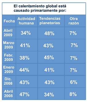 No debe resultar extraño que la última encuesta de la famosa encuestadora norteamericana Rasmussen haya encontrado que hoy el 34% de la población cree que el calentamiento global es causado por el hombre y sus emisiones de CO2, pero que el 48% piensa que el calentamiento obedee a causas naturales o planetarias. Lo curioso es comprobar cómo los “escépticos” del clima han ido aumentado y los “creyentes” han ido disminuyendo en apenas 1 año!La encuestadora Rasmussen es un firma de publicaciones electrónicas especializada en la recolección de la cobertura más completa de la opinión pública en todos lados. El presidente de Rasmussen Reports, Scott Rasmussen, ha sido un encuestador independiente por más de una década. La encuesta con todos los detalles está disponible en el sitio web de la agencia Rasmussen.