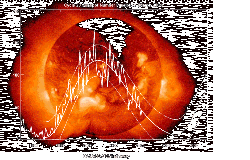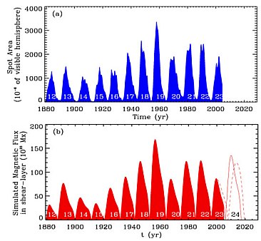Prediciendo los Ciclos 24 y 25El “Predictive Fluxtransport Dynamo Model” [Modelo de Predicción de la Dínamo Transporte de Flujo] está permitiendo a los científicos del NCAR predecir que el próximo ciclo solar, conocido como Ciclo 24, producirá manchas a lo largo y ancho de un área ligeramente mayor que 2,5% de la superficie visible del sol. Los científicos esperan que el ciclo comience a fines de 2007 o a principios de 2008, que son unos 6 a 12 meses más tarde de lo que un ciclo normal comenzaría. El probable que el Ciclo 24 alcance su pico en 2012.