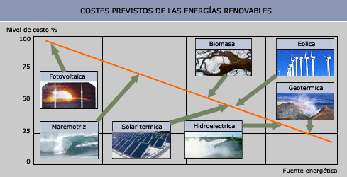 Como fuentes renovables, costosas en estos momentos, pero de interés futuro tenemos la energía solar fotovoltaica y la maremotriz. La industria de la energía fotovoltaica esta desarrollando importantes avances tecnológicos que han hecho que su coste se reduzca, en los últimos 8 años, en un 80% y que se prevea nuevas reducciones importantísimas, de mas del 70% adicional, en los costos de producción en los próximos años. Aun así la energía fotovoltaica mantendrá, en un horizonte de diez años, costos no competitivos con el resto de otras energías renovables, como vemos en el gráfico.