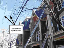 ![]() Figura 1. Cable de tendido eléctrico ubicado a 16 pies del sitio de trabajo en que se pintaba, caso de estudio 2 de FACE. Foto cortesía de La Administración de Seguridad y Salud Ocupacionales de North Carolina [NIOSH 2004b]. |