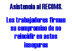 En el mes de Enero de 2003, se crea e implementa un programa educativo llamado “Reuniones de Comportamiento Seguro ” RECOMS “, como una herramienta preventiva. Este programa funciona de la siguiente manera : Todos aquellos trabajadores que sean encontrados incumpliendo normas de seguridad, realizando procedimientos inseguros, etc, son citados el día viernes al RECOMS, allí se manejan 3 aspectos, uno en el que algún directivo de la empresa les llama de forma verbal la atención y exigen mayor compromiso con la seguridad, seguido se pasa un video sobre el cual se reflexiona y al final los trabajadores firman un compromiso de no volver a cometer la misma falta y se registran en una cartelera donde se colocan un sello de cara triste. Esta actividad no tiene en principio consecuencias disciplinarias, sin embargo si el trabajador reincide y alcanza a colocarse 3 cara tristes, se le hace un llamado de atención con copia a su hoja de vida. Con esta actividad les demostramos a los trabajadores que creemos en que ellos pueden dar una respuesta positiva sin necesidad de sanciones disciplinarias y basada en educación. Esta actividad ha dado un gran impacto pues se observa la buena respuesta de los trabajadores, su compromiso para no volver al RECOMS y quienes han repetido muestran claramente su sentir por haber vuelto.