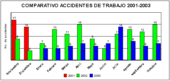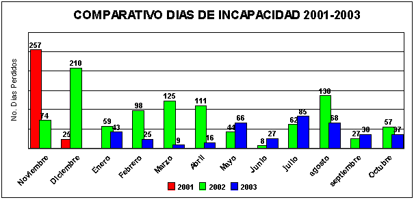Con respecto al año pasado se ha logrado reducir la severidad en un 43%, pasando de 729 días perdidos por incapacidad durante el periodo de enero a octubre de 2002, a 414 días perdidos en el mismo periodo del 2003.