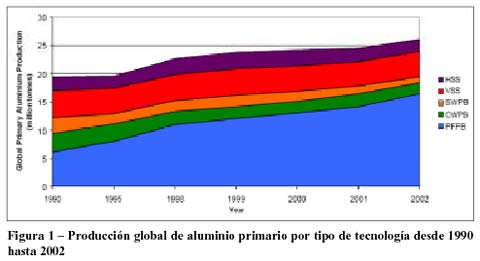 La Figura 1 muestra que la producción mundial anual de aluminio primario creció en el período 1990 – 2003 de 19,5 millones de toneladas a 26,1 millones. La Figura 1 también ilustra que el incremento de la producción durante ese período se debió a la mayor incorporación de tecnologías PFPB y que ha habido también una pequeña disminución en la producción a partir de tecnologías CWPB y SWPB. Finalmente, el nivel de producción con Søderberg VSS y HSS ha permanecido constante desde 1990 hasta 2002.
