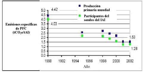Las emisiones específicas de PFC expresadas en CO2 equivalente fueron estimadas multiplicando el valor de la mediana de las emisiones específicas, en toneladas de CO2 equivalente por tonelada de aluminio, de cada uno de los cinco tipos de tecnología de reducción, por la cantidad de toneladas de producción primaria para cada tipo de tecnología que no cumplió con los requerimientos de información de la encuesta. Las toneladas adicionales de CO2 equivalente correspondientes a la producción de los que no participaron en la encuesta fueron sumadas a las toneladas de CO2 equivalente correspondientes a los participantes del sondeo. La cantidad total de CO2 equivalente proveniente de los que participaron y de los que no participaron de la encuesta fue luego dividida por la producción primaria global total para obtener una estimación de las emisiones específicas globales. La Figura 3 muestra que las emisiones globales han sido reducidas desde 4,42 tCO2e/tAl en 1990 hasta 1,53 tCO2e/tAl en 2002; se ve claramente una reducción del 65,4%. El hecho de que los valores de las emisiones específicas globales sean levemente mayores que los correspondientes a los participantes del sondeo se debe a que las plantas Søderberg emiten más y están poco representadas en los resultados de la encuesta.