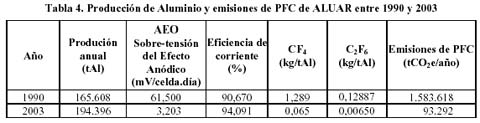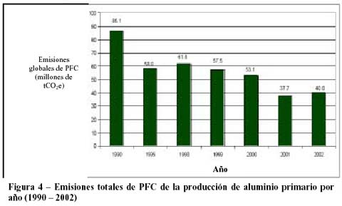 La Tabla 4 muestra que las emisiones de CF4 de ALUAR cayeron desde un valor de 1,289 kgCF4/tAl en 1990 a un valor de 0,065 kgCF4/tAl en 2003, esto nos da una reducción del 94%. Un porcentaje de reducción similar se obtiene con las emisiones de C2F6. Claramente se puede ver que ALUAR ha alcanzado y ha superado la reducción de emisiones de PFC del 80% sugerida por la iniciativa voluntaria del IIA. Debe destacarse que los lineamientos del IIA son voluntarios y que ALUAR no está sujeto a ninguna legislación nacional u otro requerimiento tendiente a reducir las emisiones de PFC. Por ello, ALUAR podría seguir operando su planta sin necesidad de reducir sus emisiones de PFC.