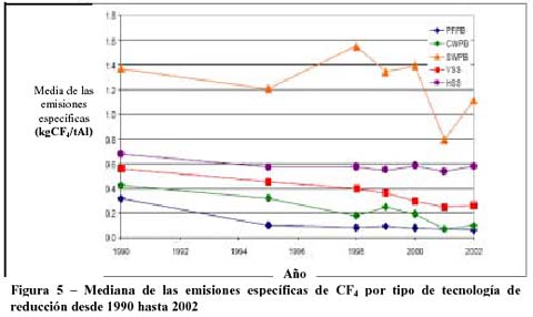 Mientras que se observa un progreso en la tendencia global durante el período 1990-2002 para todos los tipos de tecnología, un leve aumento en la media de las emisiones de CF4 fue registrado en el año 2002 para todas las tecnologías excepto para las plantas PFPB, en las cuales el registro de reducciones permanece continuo para cada uno de los años de la encuesta.