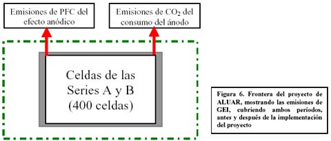 Para los propósitos de este análisis, la frontera del proyecto es el sitio físico y geográfico de las celdas de las Series de electrólisis A y B (400 celdas) en la fundición de aluminio. Esquemáticamente, la Figura 6 muestra la frontera del proyecto indicando las emisiones de PFC asociadas con el efecto anódico y las de CO2 del consumo del ánodo.