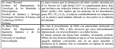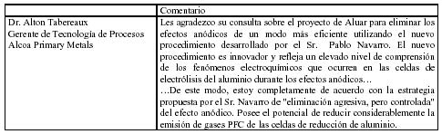 Durante el proceso de obtención de los comentarios de los interesados en relación con el proyecto de MDL de Aluar, nuestra empresa tiene que presentar las opiniones técnicas de los especialistas de la industria del aluminio en lo que se refiere al procedimiento descrito por el Sr. Navarro.