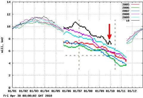 En cuanto al hielo flotante del Ártico, alrededor del 90% del hielo que se forma y se derrite todos los años, desde hace tres años se está recuperando a una velocidad que no se había registrado en los últimos 30 años. Por ejemplo, la reducción de la extensión de hielo del Ártico comienza todos los años más o menos alrededor del 11 de marzo de cada años, días más, días menos –pero no 30 días más tarde como ha ocurrido este año del Señor de 2010. Para peor hace un par de días hubo un “rebote” y la extensión del hielo aumentó súbitamente, algo que no se había registrado desde que se llevan registros satelitales del Ártico. De acuerdo con los institutos que monitorean los hielos, el aumento fue notable. Esto es lo que el DMI Center for Ocean and Ice de Dinamarca muestra el 30 de abril, donde se ha destacado al aumento del 28 de abril: