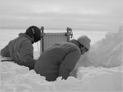 ![]() Pueden compararse directamente las dos fotos usando como referencia las aspas situadas en la parte superior de la estación. Harry ha estado enterrado en la Antártida bajo varios metros de nieve tomando la temperatura ambiente. |