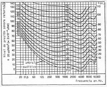 En la figura anterior se aprecia el umbral auditivo, por debajo de l, los seres humanos no pueden apreciar sonido alguno, además las curvas de nivel de sonoridad para tonos puros en campo libre, según la Norma DIN 45.630 (llamadas curvas isofónicas).