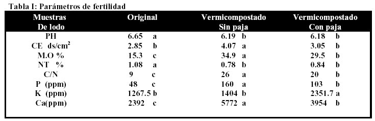 Las características químicas del vermicompuesto obtenido a partir de los lodos o sedimentos se muestran en la Tabla 1. Los valores de los parámetros de fertilidad observados posibilitan su utilización como enmienda (Mirabelli, 1998). Comparado con el lodo sin vermicompostar se presentaron aumentos en la materia orgánica, conductividad eléctrica, relación C/N, contenidos de calcio, potasio (con paja) y fósforo, observándose disminuciones en el pH y en el nitrógeno total