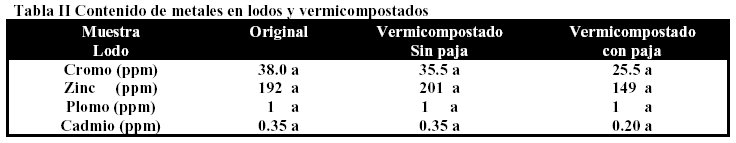 Respecto al contenido de metales en los sedimentos antes y luego del vermicompostaje (Tabla II), no se presentaron concentraciones de toxicidad, según normas Españolas ( BOE, 1990 ) y Belgas (Comunidad Europea) de permisión para metales.. Solamente el cromo presentó valores algo mas altos que los permitidos para uso en cultivos hortícolas según dichas normas.