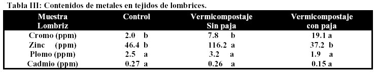 La concentración de metales en los tejidos de lombrices luego del vermicompostaje solo presentó diferencias significativas para el cromo y zinc, observándose un mayor contenido cromo en el tratamiento con paja y zinc en el tratamiento sin paja.