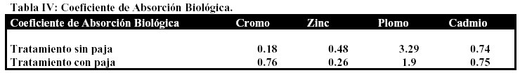 El cociente absorción biológica (Edwards et al., 1996), relación de concentración de metal en lombriz / metal en sustrato, (Tabla IV), indicaría, de superar la unidad, que hay acumulación del metal en la lombriz.