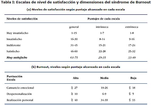 Este instrumento mide las tres dimensiones del síndrome, cansancio emocional, despersonalización y realización personal. Cada subescala se valora de manera independiente y según el puntaje alcanzado en cada una de ellas, el resultado clasifica como alto, medio o bajo. Los resultados de cada escala no se combinan, por lo tanto a diferencia del instrumento que mide satisfacción, no resulta en una puntuación global de Burnout. (Tabla I (b)).