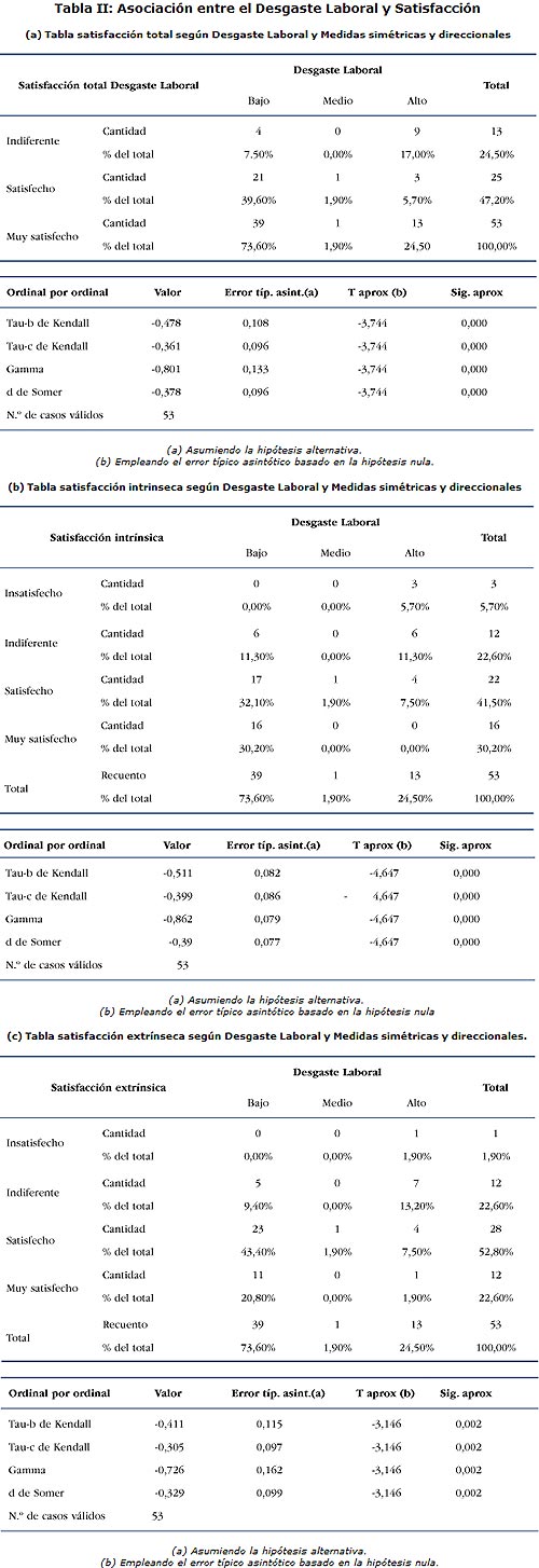 Considerando los 53 empleados que resultaron con Síndrome de desgaste laboral se considera la relación entre Satisfacción total, intrínseca y extrínseca, con el nivel de Desgaste Laboral. Las medidas de asociación indican que a mayor nivel de satisfacción, menor es el grado de desgaste laboral. La medida Tau-b de Kendall nos proporciona un valor de -0,48 (Tabla II a), lo cual significa un moderado grado de asociación negativa. Estas conclusiones coinciden cuando se toman por separado la satisfacción intrínseca y extrínseca (Tabla II b y c).
