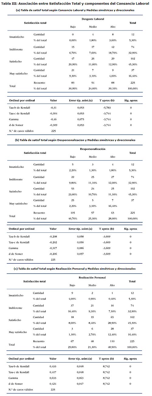 Considerando los componentes del Síndrome de Desgaste Laboral, despersonalización, cansancio y realización personal, existe un grado de asociación negativa entre la satisfacción total y el cansancio laboral, a menor nivel de satisfacción mayor cansancio (Tabla III a, Tau-c de Kendall: – 0,30). Lo mismo se observa con la despersonalización, cuyo valor es un poco más bajo (Tabla III b, Tau-c de Kendall: – 0,20).
