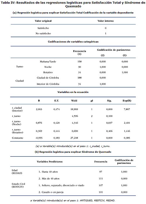 A través del modelo de regresión logística se determinaron, en primer lugar los factores de riesgo que afectan a la Satisfacción Total. Resultaron estadísticamente significativas (Tabla IV a) a un nivel de significación de 0,10, ciudad del hospital y turno de trabajo. De ello, se puede concluir que: