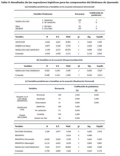 Para cansancio emocional, la categoría de referencia de la variable agrupó los niveles medio y alto. Del análisis de la Tabla V (a), se puede concluir que: