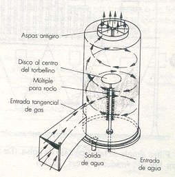 En los depuradores dinámicos de gas se rocía una película de agua sobre una superficie en movimiento, como las aspas de un ventilador por ejemplo. En un depurador de rocío centrífugo (Ver figura), los gases se introducen en forma tangencial hacia dentro de un ciclón en donde las gotas se emiten hacia fuera del rociador que se encuentra en el centro. Las gotas adquieren un movimiento en espiral, ya que son relativamente grandes e interceptan las partículas de polvo. En la pared la película húmeda evita la reincorporación de las partículas después de su captura.