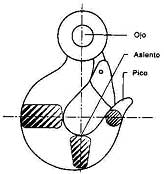 Figura 9 Distintos tipos de anillos y su resistencia relativa Al igual que los cáncamos la capacidad de carga varía en función del diámetro de su sección recta, de su forma geométrica y del acero con que se fabrico. Cualquier deformación disminuye su capacidad de carga por lo tanto al primer cambio de su forma geométrica deben ser sustituidos. 3.3. GANCHOS Su diseño esta hecho de tal manera que la forma de ellos permita un rápido y seguro enganche de las cargas, pero están expuestos a un desenganche accidental por tal motivo a los mismos se les incorpora un seguro, para prevenirlo. En la figura 10 se representa un gancho tipo, cabe destacar que existe muchos diseños de los mismos, siendo el representado la forma más común. Por lo general la forma de la sección del gancho es trapezoidal o rectangular, salvo en la zona del pico, donde casi siempre es redonda.